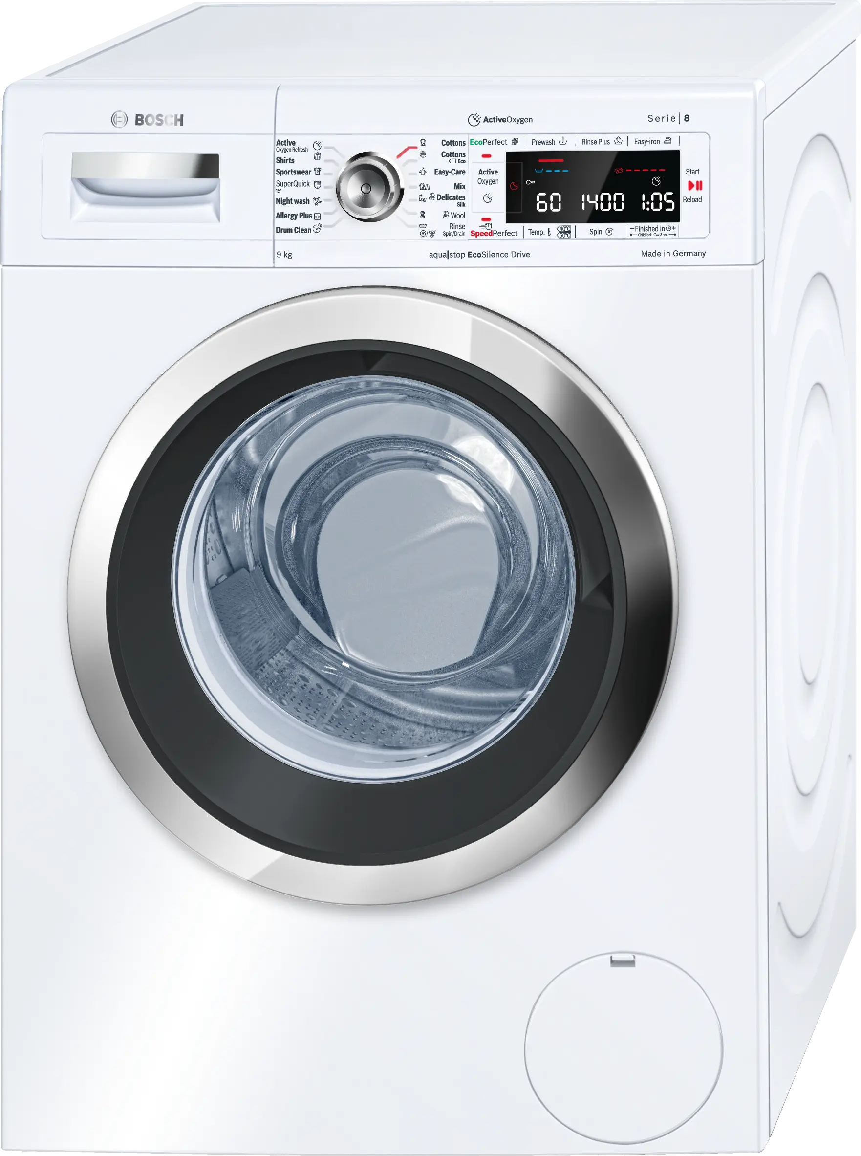 Большой LED-дисплей для индикации статуса программы, выбора температуры, максимальной скорости отжима, остаточного времени, отсрочки окончания программы до 24 ч, активации ActiveOxygen и индикации потребления ресурсов