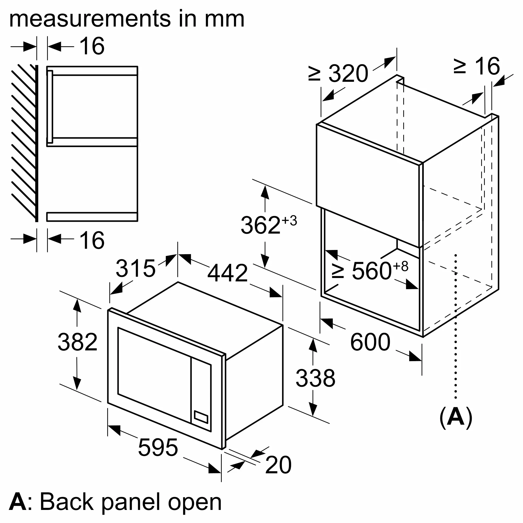 Размеры ниши для встраивания (ВхШхГ): 362 мм - 365 мм x 560 мм - 568 мм x 320 мм