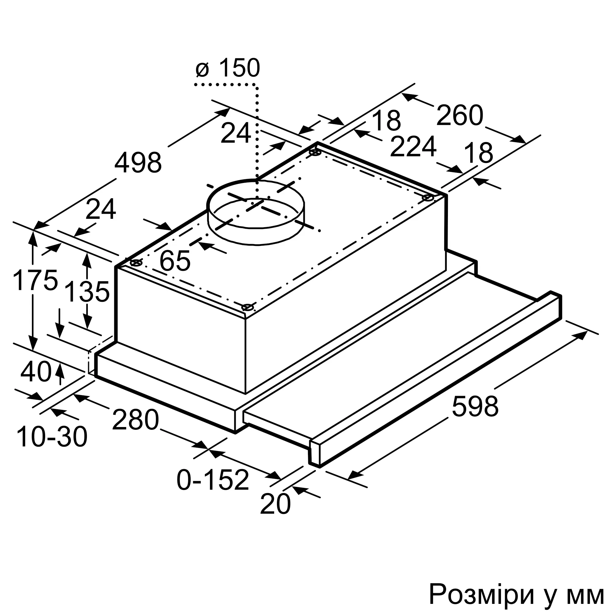 Розміри приладу, монтаж для роботи у режимі відведення повітря (ВxШxГ): 175-175 x 600 x 280 мм