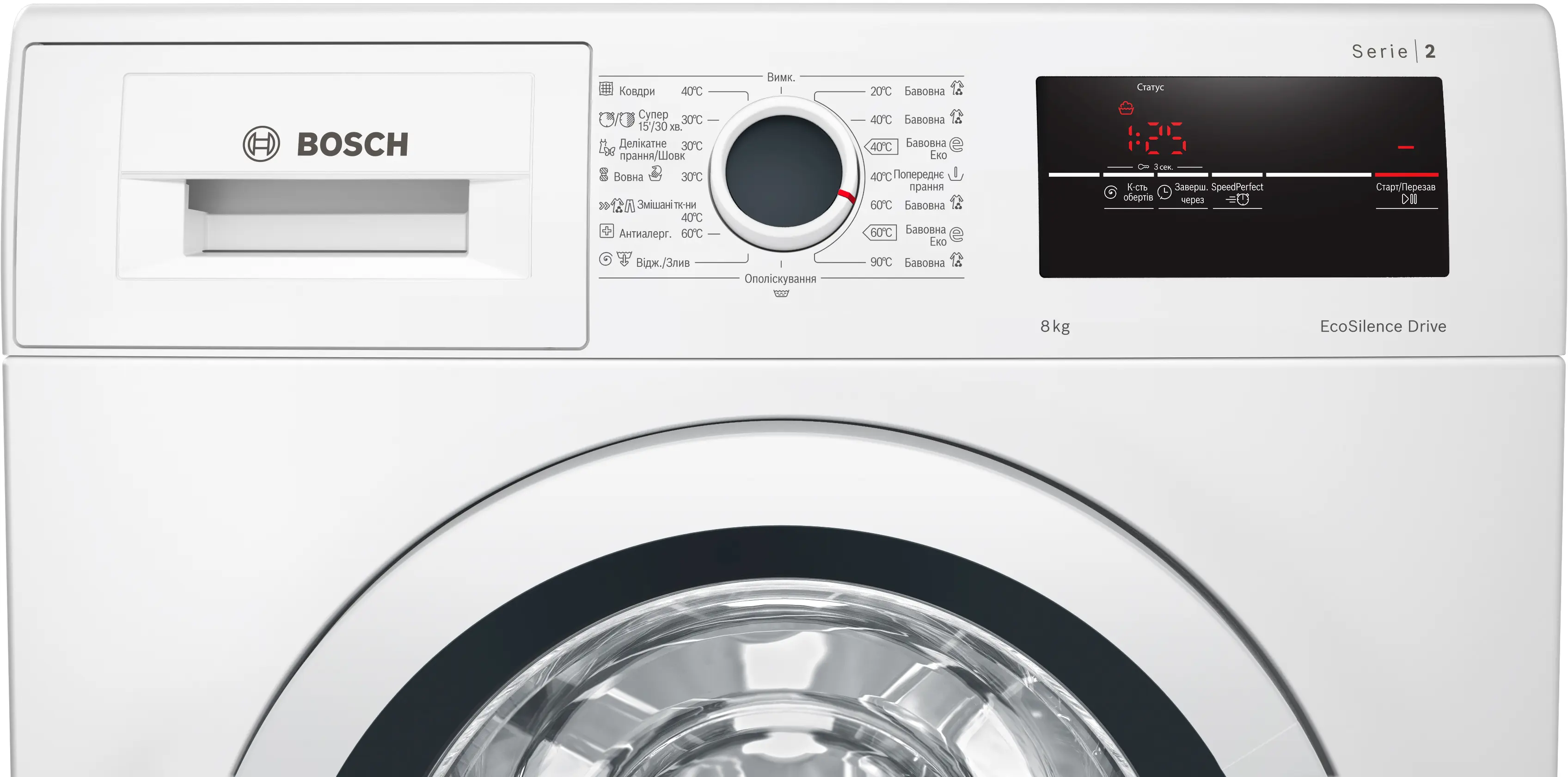 Великий світлодіодний дисплей для індикації ходу програми, обраних додаткових опцій, рівня температури, кількості обертів віджимання, залишкового часу прання, відтермінування старту прання на 1 - 24 год та рекомендацій щодо завантаження