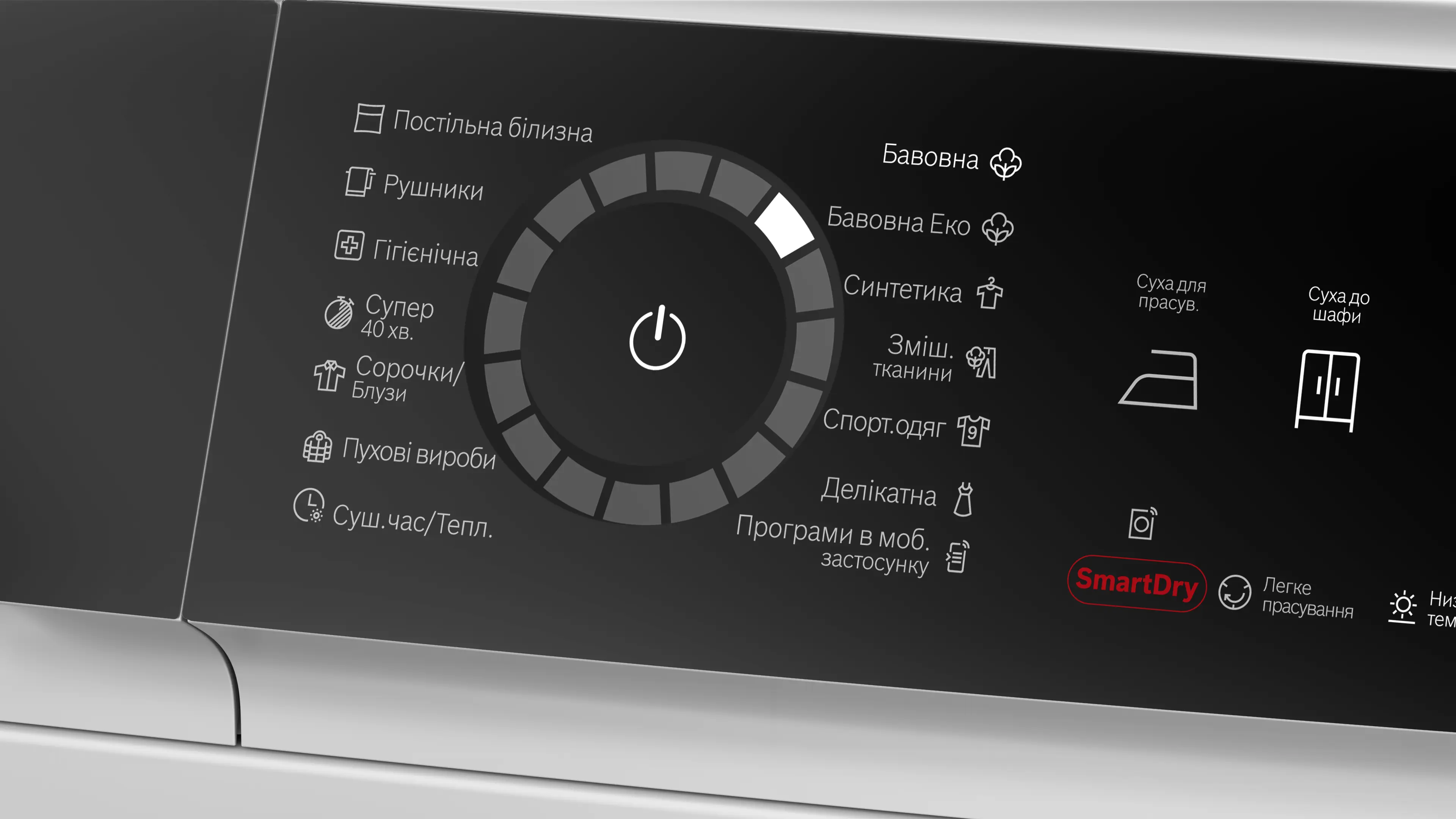 Сенсорні кнопки TouchControl: basic setup, Iron dry, Cupboard dry, Cupboard dry+, Програмування старту прання, Half load, Child lock, Легке прасування, Моя програма, Power button, Remote Start, Зниження температури сушіння, smartDry/IntelligentDry, Start / Reload / Pause, 24 Програмування старту прання