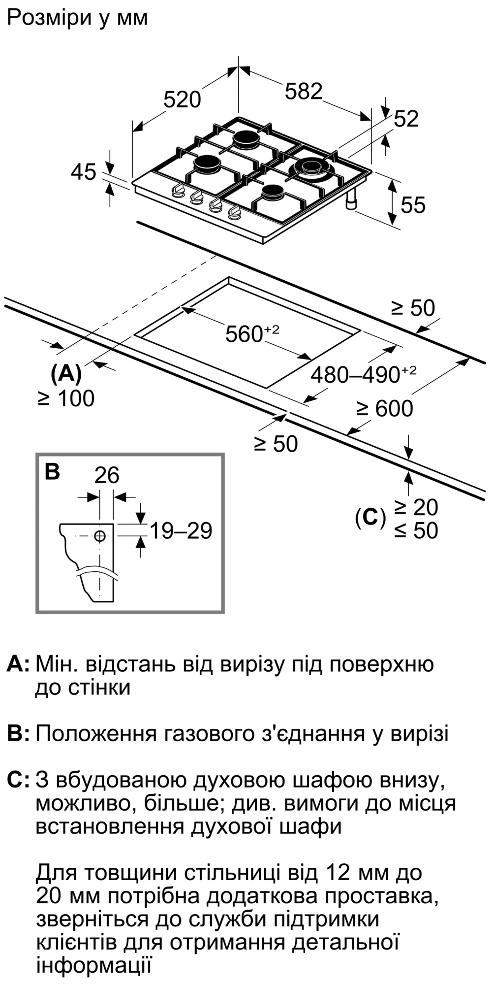 Мін. товщина стільниці: 20 мм